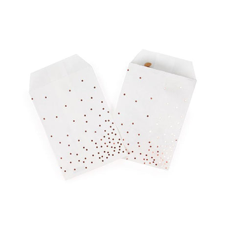 Normaler Preis €14,05Grundpreis /Nicht verfügbarNachbestelltPapier-Klappenbeutel Weiß mir Rose Gold Punkten 76x127 mm - 100 Stk