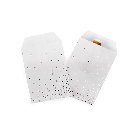 Normaler Preis €26,40Grundpreis /Nicht verfügbarNachbestelltKlappenbeutel Papier Weiß mit Silber Punkte 127x203 mm - 100 Stk