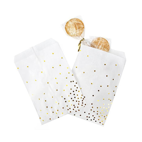 Normaler Preis €26,40Grundpreis /Nicht verfügbarNachbestelltKlappenbeutel Papier Weiß mit Gold Punkten 127x203 mm - 100 Stk
