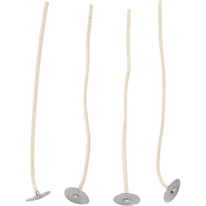 Flache, gewachste Baumwoll-Dochte mit kleinem Aluminiumteller an einem Ende - geeignet für die Kerzenherstellung mit Wachsgel, Rapswachs oder einer Mischung aus Stearin, Paraffin und reinem Wachs, z.B. in kleinen Glashaltern.