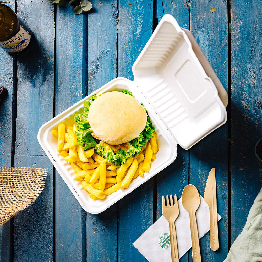 Take-away in robusten Schalen: Die Schalen sind besonders für Fast Food und Fingerfood geeignet. Auch fetthaltige Speisen wie gebratene Knödel lassen sich sicher verpacken. Da die Schalen aus Zuckerrohr gefertigt sind, sind sie bereits von sich aus robust und benötigen daher keinen zusätzlichen Schutz durch eine Beschichtung.